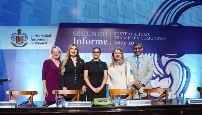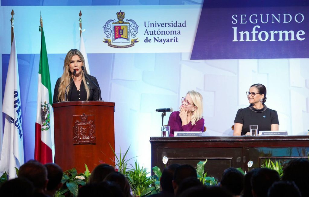 En representación del gobernador del estado de Nayarit, Miguel Ángel Navarro Quintero, la secretaria general de Gobierno, Rocío Esther González García, estuvo presente en el Segundo Informe de Actividades de la rectora de la Universidad Autónoma de Nayarit, Norma Liliana Galván Meza. Durante este evento, se resaltaron los logros en materia educativa, deportiva, científica y en cada uno de los rubros donde la máxima casa de estudios tiene gran presencia dentro y fuera del país.