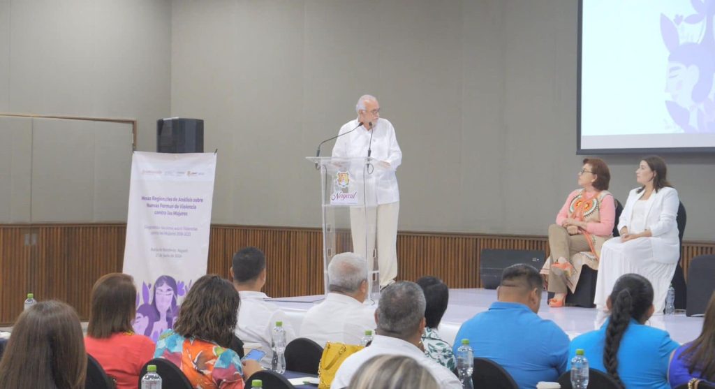 Bahía de Banderas, Nayarit; 21 de junio de 2024.- El gobernador del estado, Miguel Ángel Navarro Quintero, en compañía de su esposa, la presidenta del DIF Nayarit, doctora, Beatriz Estrada Martínez, inauguró los trabajos de las Mesas Regionales de Análisis sobre Nuevas Formas de Violencia contra las Mujeres, Adolescentes y Niñas, donde reiteró que hoy en día más que estar en una alerta de género, están en una alerta de conciencia social porque existe un común denominador, que es la violencia, y ello los convoca a tener este tipo de mesas regionales para analizar e identificar nuevas manifestaciones y modalidades de violencia.