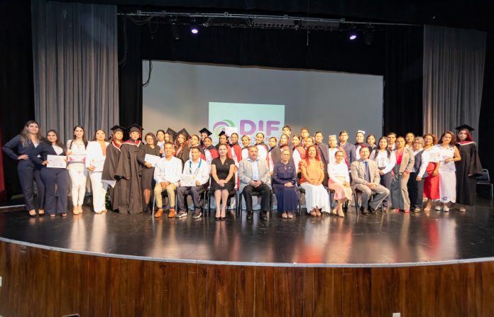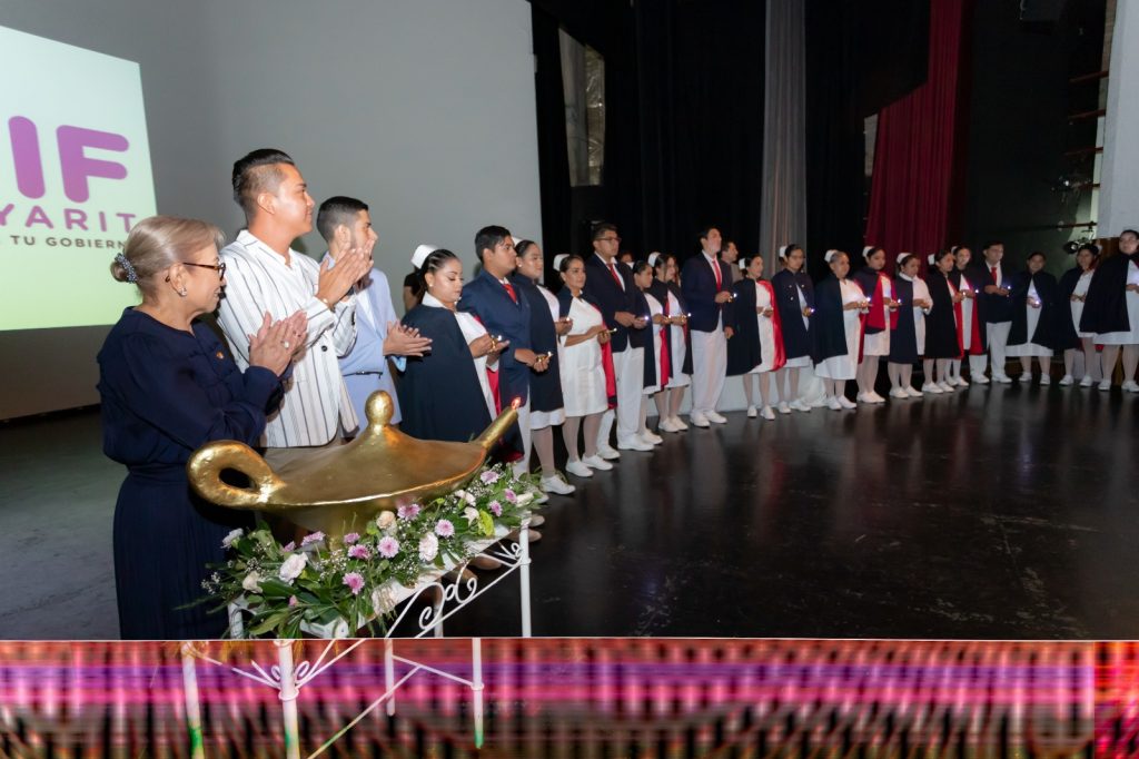 El evento tuvo lugar en las instalaciones del Teatro del IMSS, donde la titular de la asistencia social en el estado, reconoció el deseo de superación de cada estudiante, quienes con esfuerzo y compromiso culminaron esta etapa de preparación profesional.