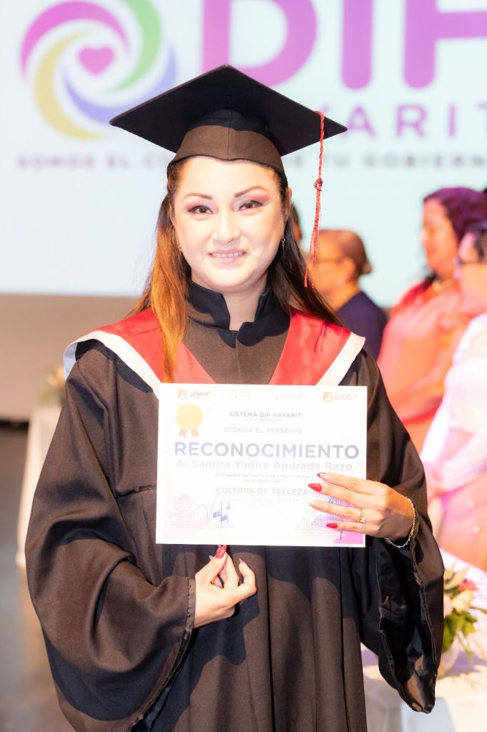 Tepic, Nayarit; 26 de junio del 2024.- La presidenta del Sistema DIF Nayarit, Beatriz Estrada Martínez, encabezó el acto de clausura del ciclo escolar 2023-2024, de los cursos del Centro de Capacitación (CECAP), de los cuales egresaron 46 estudiantes.