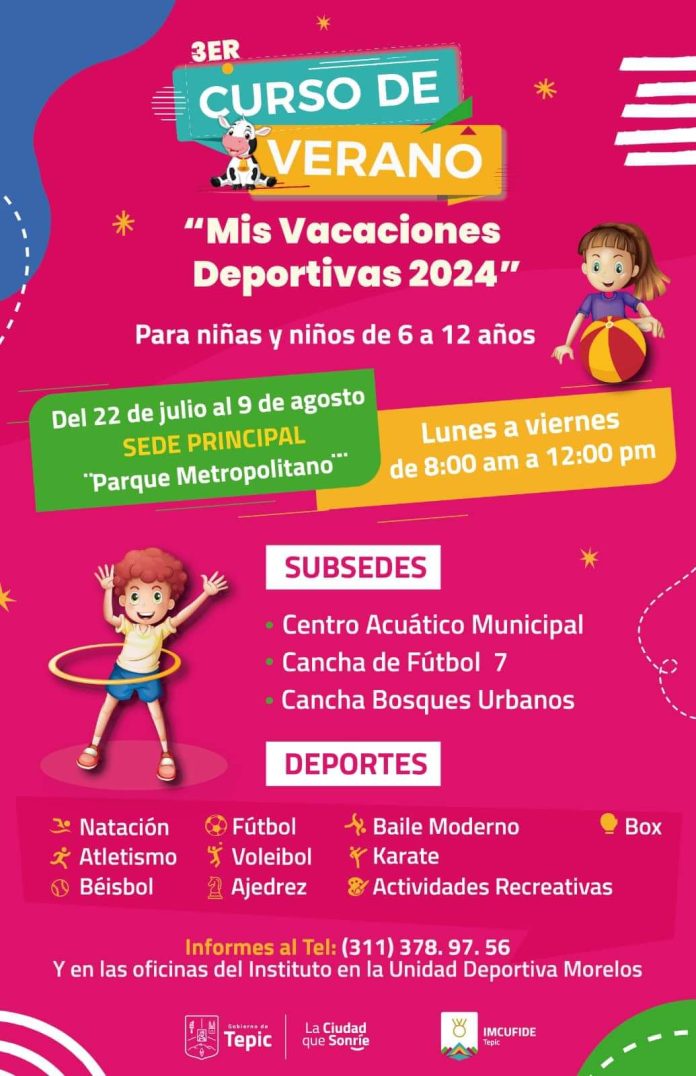 El Gobierno de Tepic, a través del Instituto Municipal de Cultura Física y Deporte (IMCUFIDE), invita a las niñas y niños de 6 a 12 años de edad, a participar en el tercer curso de verano «Mis Vacaciones Deportivas 2024».