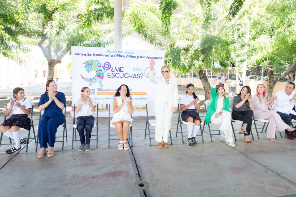 Tepic, Nayarit; 4 de julio de 2024.- Con el objetivo de ofrecer a la infancia y juventud un espacio donde puedan expresarse libremente, la presidenta del Sistema DIF Nayarit, doctora Beatriz Estrada Martínez, junto con la titular del Sistema Nacional DIF, Nuria Fernández Espresate, visitaron la escuela primaria Pedro Casas, en Tepic, donde se escucharon las voces de 447 niñas y niños que participaron en la consulta nacional «¿Me Escuchas?» 2024.