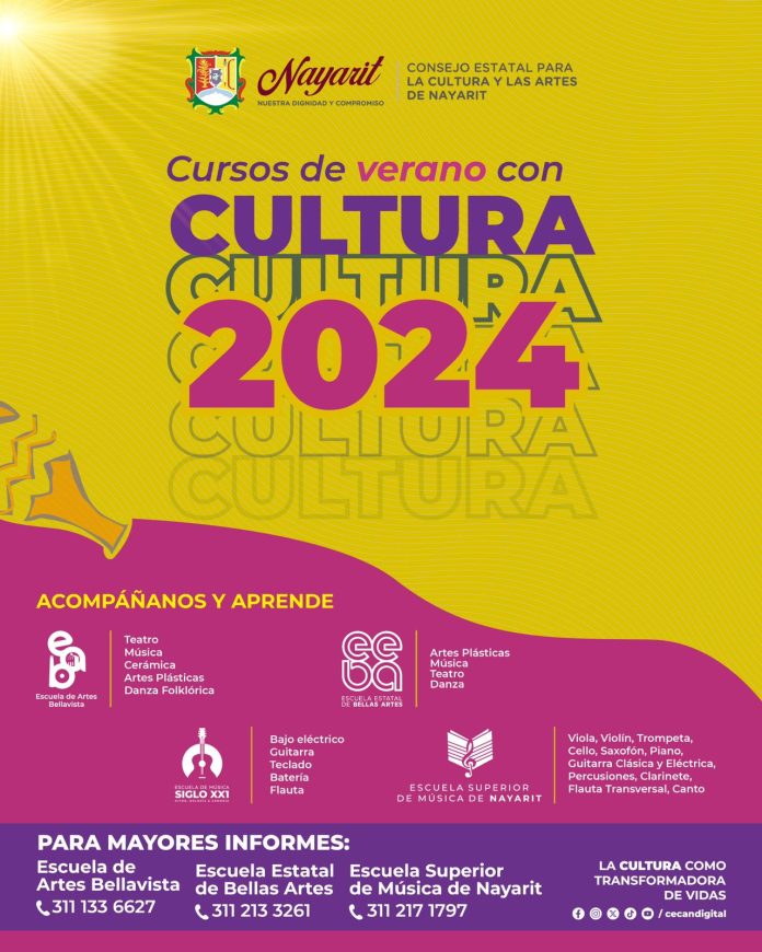 El Gobierno del Estado, a través del Consejo Estatal para la Cultura y las Artes de Nayarit, ofertará cursos de verano especializados en artes, mismos que serán impartidos en la Escuela Superior de Música, la Escuela Estatal de Bellas Artes, la Escuela de Artes Bellavista, en Tepic y la Escuela de Música Siglo XXI en Ruiz. La oferta académica contempla las disciplinas de teatro, instrumentos, canto, artes plásticas, danza clásica, danza folclórica y danza contemporánea.