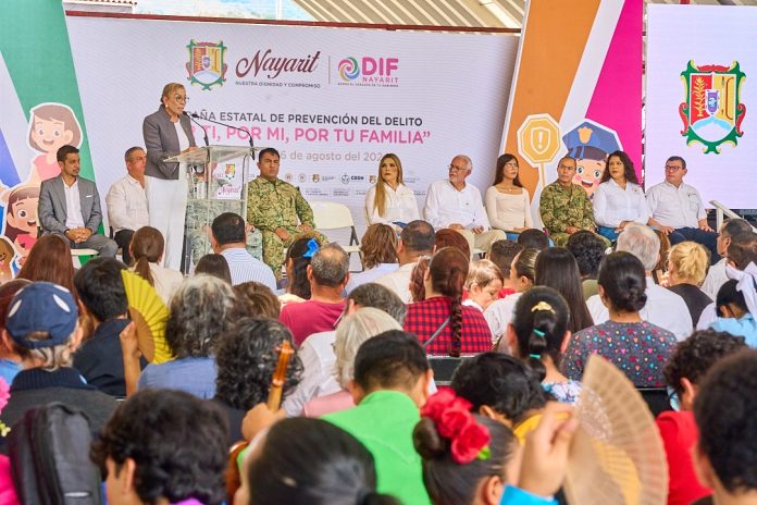Tepic, Nayarit; 16 de agosto de 2024.- Con el objetivo de construir una sociedad segura y sin violencia en los hogares, la doctora Beatriz Estrada Martínez, presidenta del Sistema DIF Nayarit, y su esposo el gobernador del estado, Miguel Ángel Navarro Quintero, arrancaron la campaña estatal de prevención del delito “Por Ti, Por Mí, Por Tu Familia”, en la Ciudad Deportiva del recinto ferial, en Tepic.