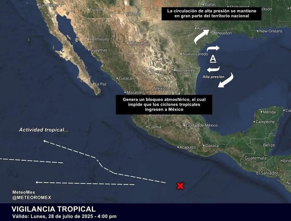 La alta presión está generando un bloqueo en la atmósfera, por lo cual ningún ciclón tropical podrá aproximarse al territorio nacional en los próximos días. No obstante, las lluvias continuarán en el occidente, centro y sur debido al ingreso de humedad.
