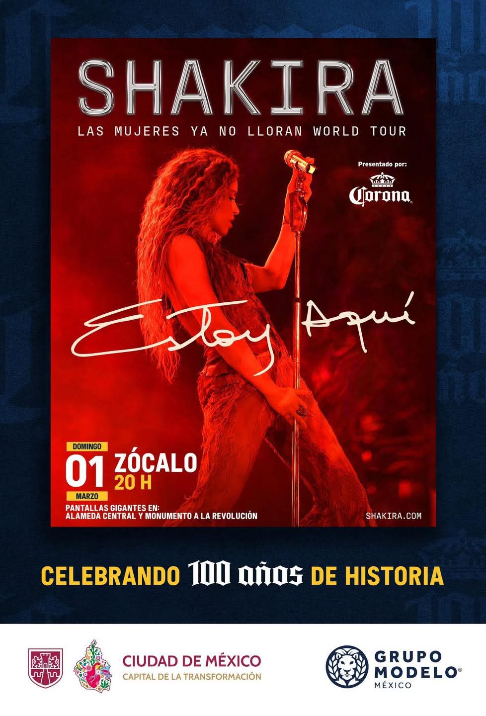La cantante colombiana Shakira se presentará en el Zócalo de la Ciudad de México en un concierto abierto al público y de acceso gratuito, el cual dará inicio a las 20:00 horas.