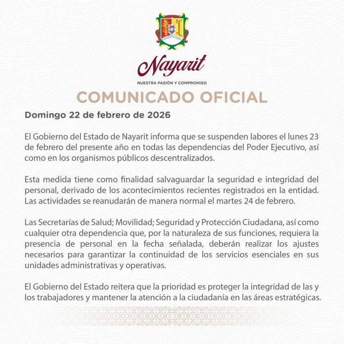 InicioGobiernoGobierno de Nayarit, suspende labores mañana lunes 23 👇 Gobierno Gobierno de Nayarit, suspende labores mañana lunes 23 👇 By Agencia febrero 22, 2026 0 26 Cuota FacebookTwitterPinterestWhatsApp Cuota FacebookTwitterPinterestWhatsApp Artículo anteriorINCENDIAN SIETE VEHÍCULOS EN LA AUTOPISTA TEPIC–COMPOSTELAArtículo siguienteMÁS VEHÍCULOS CALCINADOS EN LA TEPIC–AGUAMILPA Agencia Artículos relacionados DIF Beatriz Estrada impulsa la inclusión con entrega de auxiliares auditivos abril 19, 2026 Gobierno Nayarit entre los estados con menor incidencia de homicidio doloso en marzo abril 14, 2026 DIF DIF Nayarit trabaja para mejorar la calidad de vida de las personas en situación de vulnerabilidad, directamente en las comunidades, reafirmando su compromiso de... abril 14, 2026 DEJA UNA RESPUESTA Cancelar respuesta Comentario: Por favor ingrese su comentario! Nombre:* Por favor ingrese su nombre aquí Correo electrónico:* ¡Has introducido una dirección de correo electrónico incorrecta! Por favor ingrese su dirección de correo electrónico aquí Sitio web: Guardar mi nombre, correo electrónico y sitio web en este navegador la próxima vez que comente. - Publicidad - - Publicidad - Mas populares CIERRAN 8 CENDIS “PAULO FREIRE” EN NAYARIT POR ADEUDO FEDERAL abril 20, 2026 EXENFERMERO CONDENADO POR MUERT3 DE RECIÉN NACIDO EN HOSPITAL PRIVADO DE TEPIC abril 20, 2026 Lunes, con lluvias fuertes a muy fuertes debido a la interacción de diversos sistemas meteorológicos. abril 20, 2026 IMPORTANTE: Iniciaremos la semana de manera lluviosa en el occidente, bajío, centro y sur de México. abril 20, 2026 Cargar más Comentarios recientes A WordPress Commenter en Hello world!