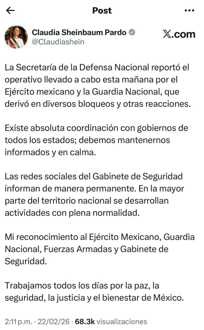 La presidenta Claudia Sheinbaum Pardo informó que tras el operativo realizado por el Ejército Mexicano y la Guardia Nacional se realizaron bloqueos en algunos puntos del país.