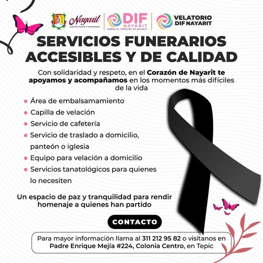 InicioDIFEn los momentos más difíciles, DIF Nayarit está contigo. Por ello te... DIFGobierno En los momentos más difíciles, DIF Nayarit está contigo. Por ello te brinda servicios funerarios accesibles y de la más alta calidad, para despedir con paz y serenidad a tus seres queridos. By Agencia marzo 6, 2026 0 32 Cuota FacebookTwitterPinterestWhatsApp Cuota FacebookTwitterPinterestWhatsApp Artículo anteriorTraslado aéreo exitoso coordinado por el Instituto Mexicano del Seguro Social en conjunto con el Centro Regulador de Urgencias Médicas, permitió el traslado de una paciente pediátrica de 13 años con quemaduras al Centro Médico Nacional de Occidente en Jalisco, para atención especializada.Artículo siguienteBeatriz Estrada fortalece la asistencia social con capacitación a los 20 DIF municipales Agencia Artículos relacionados DIF Beatriz Estrada impulsa la inclusión con entrega de auxiliares auditivos abril 19, 2026 DIF ¡Atención a las y los beneficiarios del PAB en Tepic! abril 19, 2026 Gobierno Nayarit entre los estados con menor incidencia de homicidio doloso en marzo abril 14, 2026 DEJA UNA RESPUESTA Cancelar respuesta Comentario: Por favor ingrese su comentario! Nombre:* Por favor ingrese su nombre aquí Correo electrónico:* ¡Has introducido una dirección de correo electrónico incorrecta! Por favor ingrese su dirección de correo electrónico aquí Sitio web: Guardar mi nombre, correo electrónico y sitio web en este navegador la próxima vez que comente. - Publicidad - - Publicidad - Mas populares CIERRAN 8 CENDIS “PAULO FREIRE” EN NAYARIT POR ADEUDO FEDERAL abril 20, 2026 EXENFERMERO CONDENADO POR MUERT3 DE RECIÉN NACIDO EN HOSPITAL PRIVADO DE TEPIC abril 20, 2026 Lunes, con lluvias fuertes a muy fuertes debido a la interacción de diversos sistemas meteorológicos. abril 20, 2026 IMPORTANTE: Iniciaremos la semana de manera lluviosa en el occidente, bajío, centro y sur de México. abril 20, 2026 Cargar más Comentarios recientes A WordPress Commenter en Hello world!