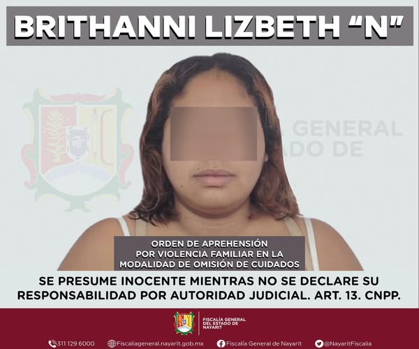 La Fiscalía General del Estado de Nayarit informó que agentes de la Agencia de Investigación Criminal detuvieron en Tepic a Brithanni Lizbeth “N”, por su presunta responsabilidad en el delito de violencia familiar en la modalidad de omisión de cuidados, en agravio de una niña cuya identidad fue reservada.