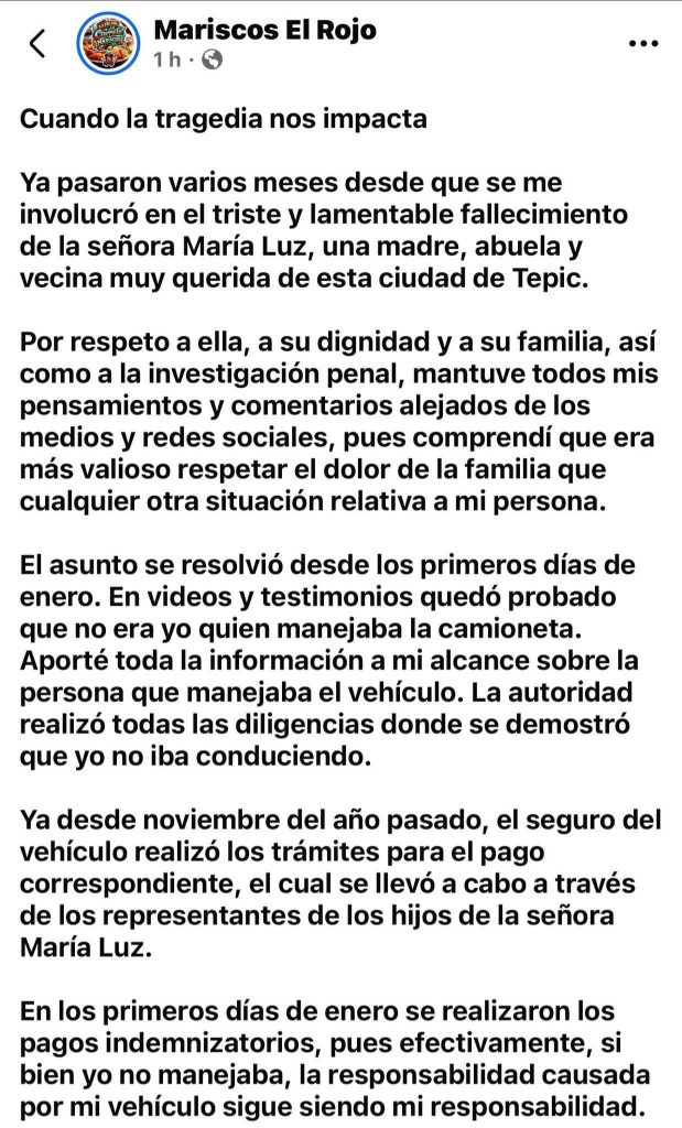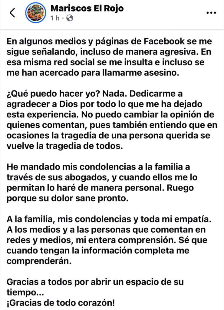 Pese a ser blanco de ataques en redes, reiteró su empatía hacia la familia y explicó que su reserva se debió al respeto por el proceso judicial y el duelo de los afectados. Concluyó enviando sus condolencias y manifestando su disposición para un acercamiento personal con los deudos cuando sea posible.