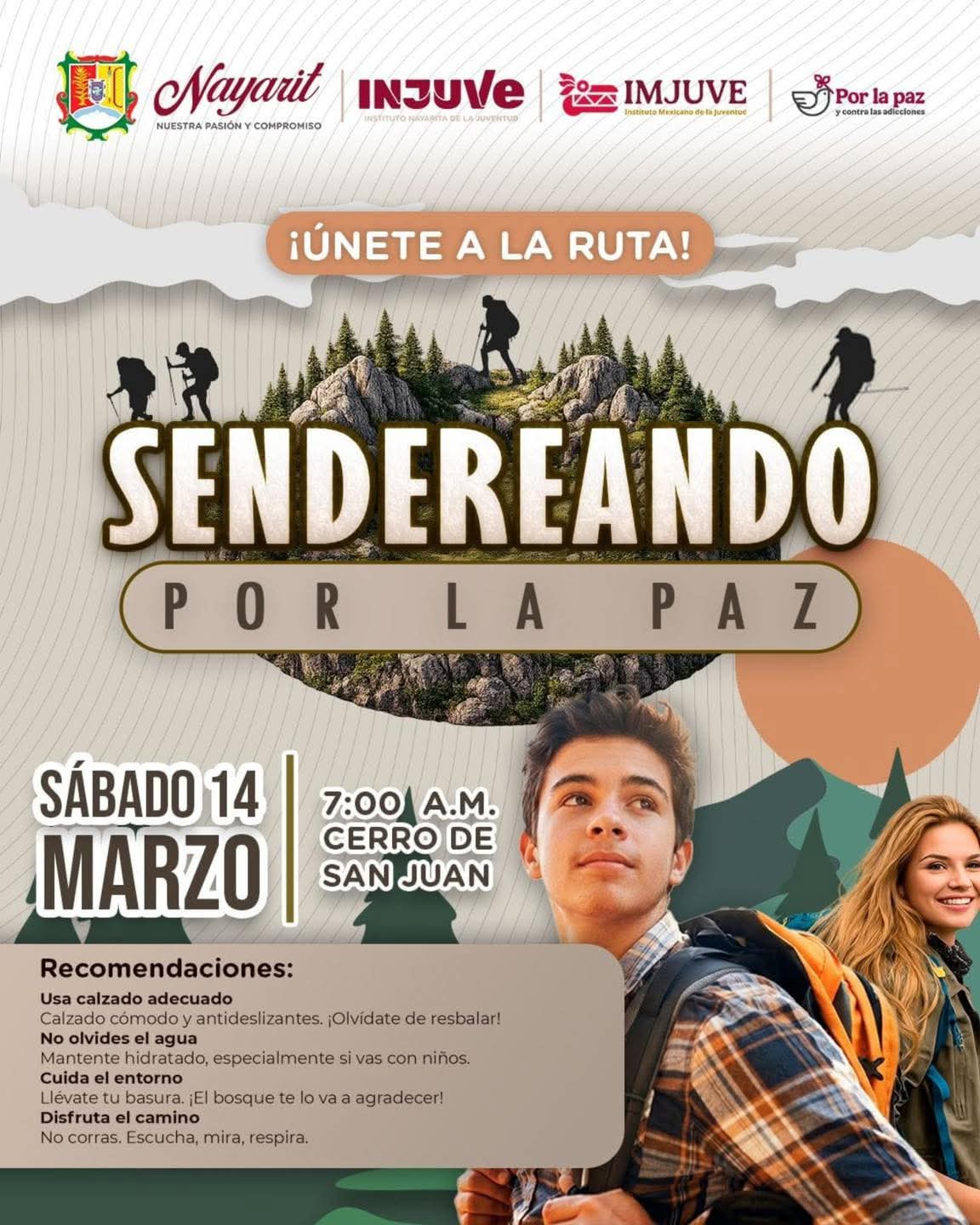 El Gobierno del Estado de Nayarit, a través del Instituto Nayarita de la Juventud (INJUVE), te invita a ser parte de “Sendereando por la Paz”, una ruta que se recorre por una cultura de paz, para conectar con la naturaleza y fomentar la sana convivencia.