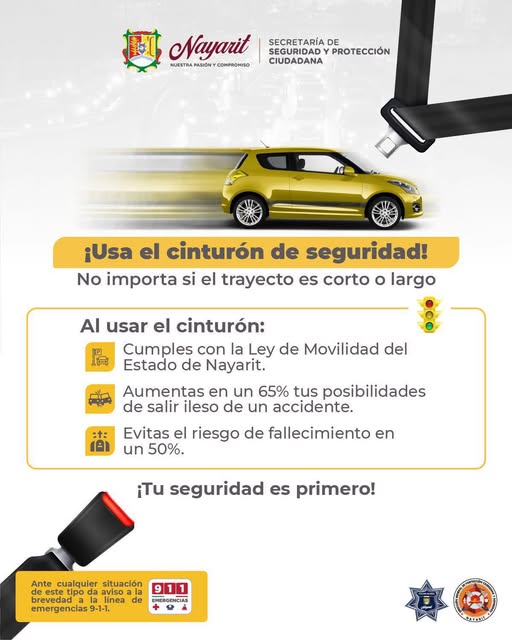 El Gobierno del Estado de Nayarit, hace un llamado a la ciudadanía a priorizar su seguridad y la de sus familias utilizando siempre el cinturón de seguridad, sin importar la distancia del trayecto.