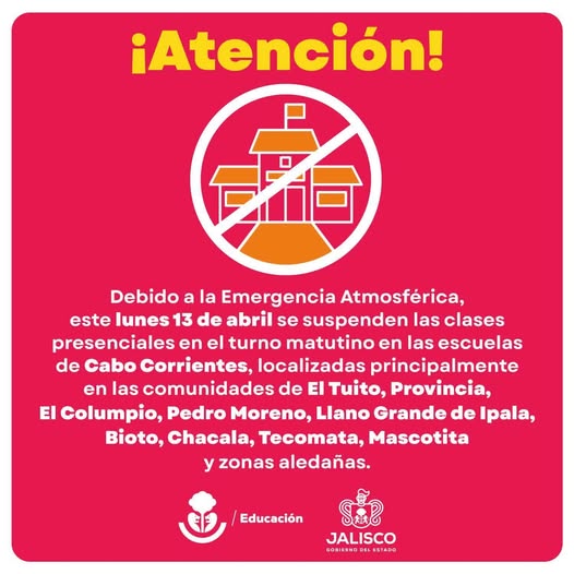 Derivado de la emergencia atmosférica, este lunes no habrá clases presenciales en el turno matutino en planteles educativos del municipio de Cabo Corrientes, Jalisco. Se pide a la población mantenerse atenta a los avisos oficiales ante cualquier actualización.