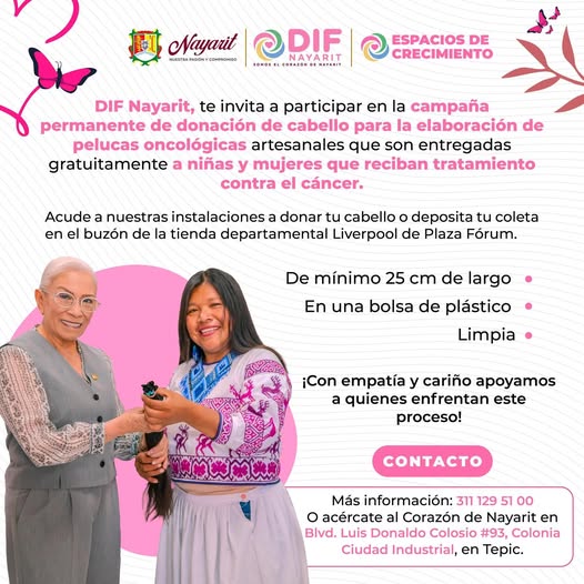InicioDIFBeatriz Estrada y el Corazón de Nayarit te invitan a donar esperanza... DIF Beatriz Estrada y el Corazón de Nayarit te invitan a donar esperanza a través de la campaña permanente de donación de cabello, destinada a la elaboración y entrega de pelucas oncológicas para quienes enfrentan con valentía la lucha contra el cáncer. By Agencia abril 13, 2026 0 7 Cuota FacebookTwitterPinterestWhatsApp Cuota FacebookTwitterPinterestWhatsApp Artículo anteriorCoordinación permanente fortalece la seguridad en NayaritArtículo siguiente¿Aún no tramitas tu nueva INE? Agencia Artículos relacionados DIF DIF Nayarit trabaja para mejorar la calidad de vida de las personas en situación de vulnerabilidad, directamente en las comunidades, reafirmando su compromiso de... abril 14, 2026 DIF Miguel Ángel Navarro y Beatriz Estrada conmemoran segundo aniversario del Hospital de la Mujer abril 14, 2026 DIF Un día especial para celebrar a las niñas y los niños abril 13, 2026 DEJA UNA RESPUESTA Cancelar respuesta Comentario: Por favor ingrese su comentario! Nombre:* Por favor ingrese su nombre aquí Correo electrónico:* ¡Has introducido una dirección de correo electrónico incorrecta! Por favor ingrese su dirección de correo electrónico aquí Sitio web: Guardar mi nombre, correo electrónico y sitio web en este navegador la próxima vez que comente. - Publicidad - - Publicidad - Mas populares OPERATIVO EN NAYARIT: CAEN 8, ASEGURAN ARM4S, DROG4 Y EXPLOSIV0S abril 14, 2026 FRANCIA CORTÉS VA POR OTRA CORONA INTERNACIONAL abril 14, 2026 Nayarit entre los estados con menor incidencia de homicidio doloso en marzo abril 14, 2026 DIF Nayarit trabaja para mejorar la calidad de vida de las personas en situación de vulnerabilidad, directamente en las comunidades, reafirmando su compromiso de... abril 14, 2026 Cargar más Comentarios recientes A WordPress Commenter en Hello world!