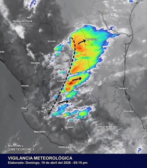 Este sistema ha provocado en las últimas horas lluvias moderadas a puntuales fuertes en #Coahuila (sur), #NuevoLeón, #Zacatecas, #Aguascalientes, #SanLuisPotosí, así como en sectores de #Jalisco y #Michoacán (norte).